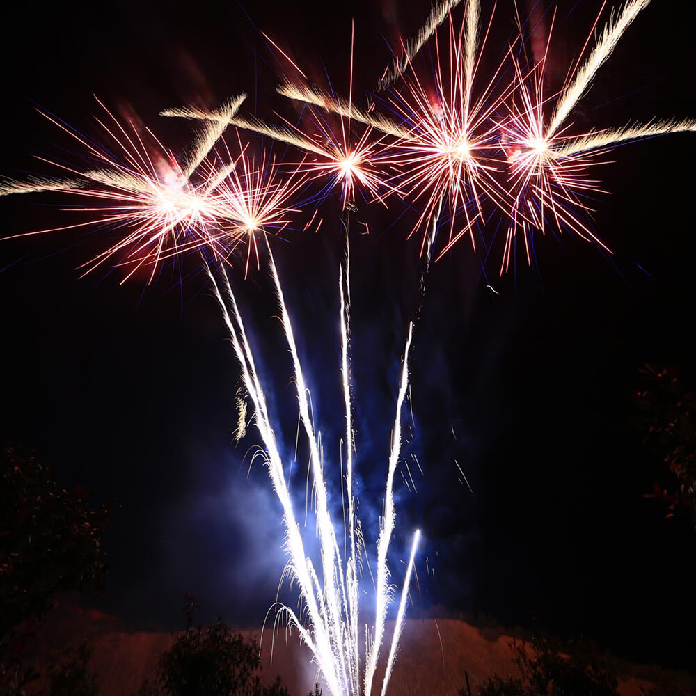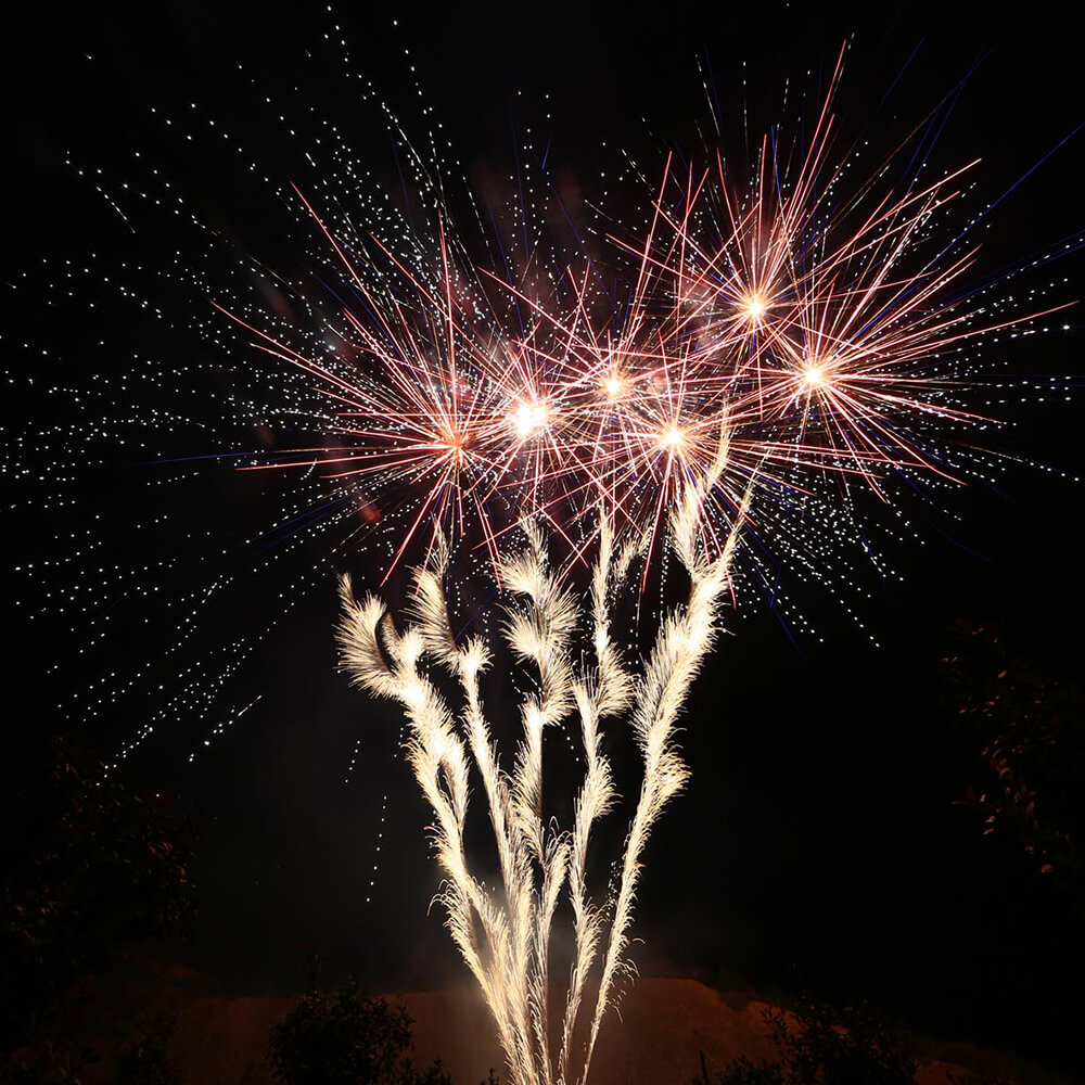 🔥 Silbern gesteppt aufsteigende Bombetten zerlegen sich kraftvoll in rote oder blaue Sternbuketts.