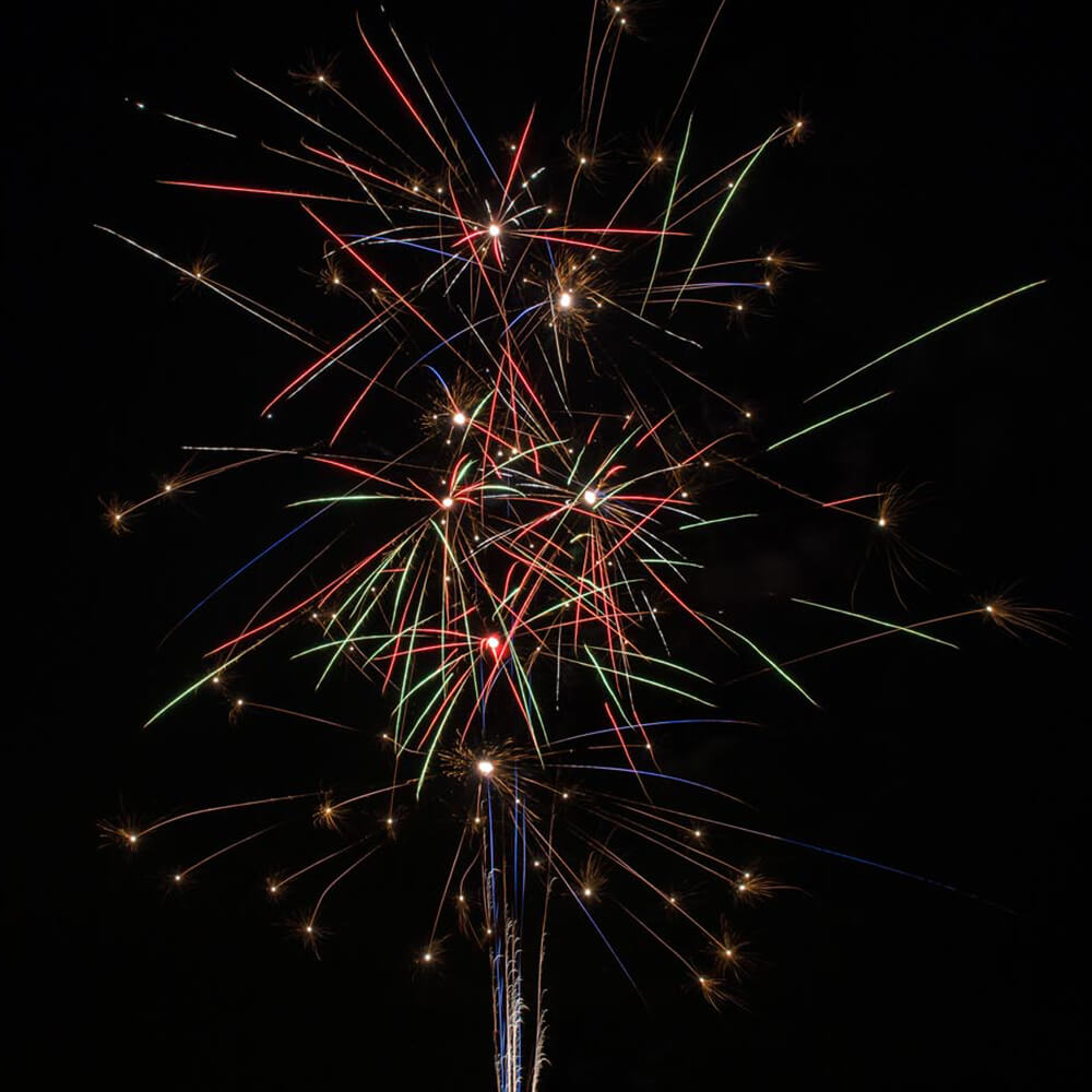 Phase3: 48 mit Silberschweif aufsteigende Sternenbuketts mit blau, rot und grünen Cracklings Effekten.