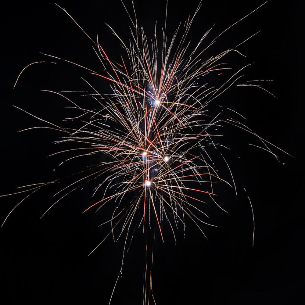Phase5: 72 Schuss in schneller Abfolge aufsteigende Effektbuketts mit bunten Sternen, Glitzereffekten oder goldenen Brokatsternen, gefolgt von einem mächtigen Finale.
