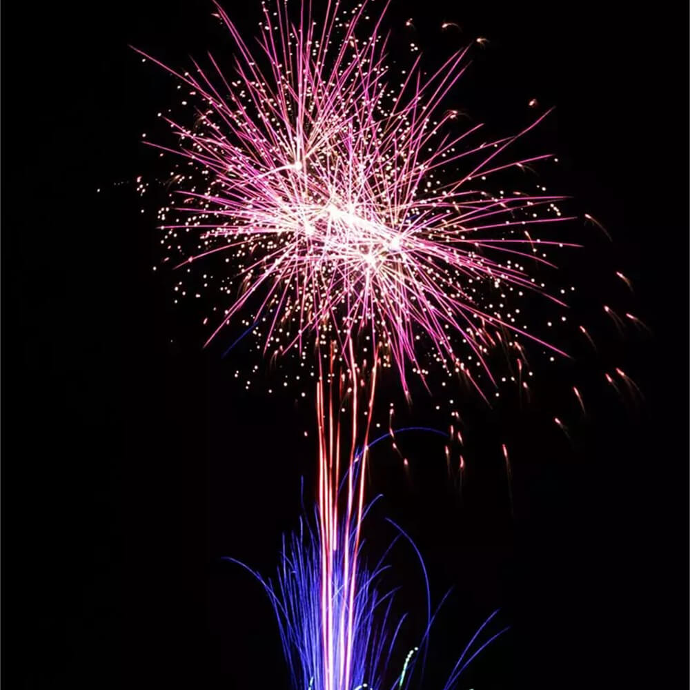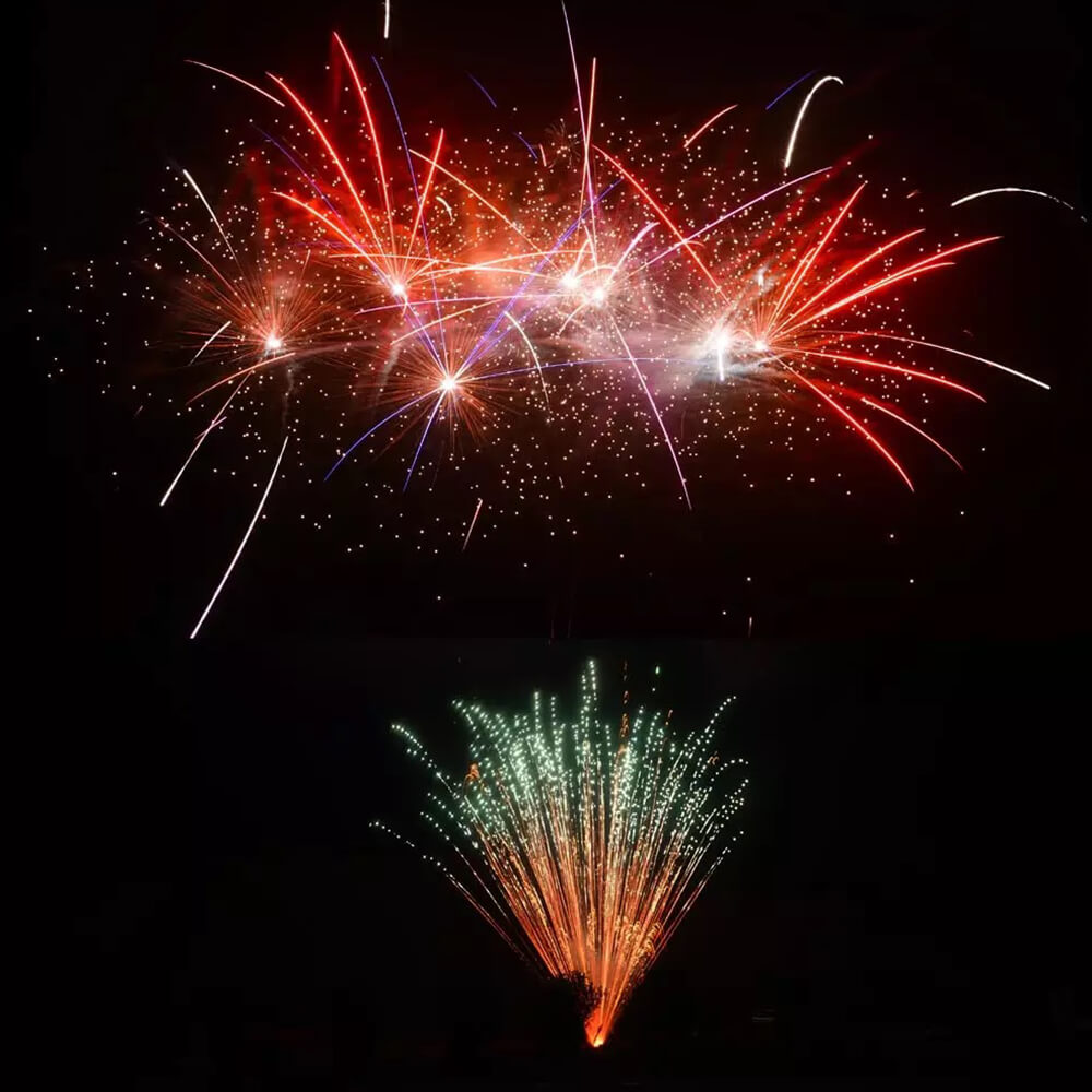 Der Start überzeugt mit grünen und lila Feuertöpfen, die kraftvoll aufsteigen und sich in prachtvolle Buketts verwandeln. Goldener, grüner und roter Glitzer sorgt für einen funkelnden Tanz am Nachthimmel – stilvoll und eindrucksvoll zugleich.