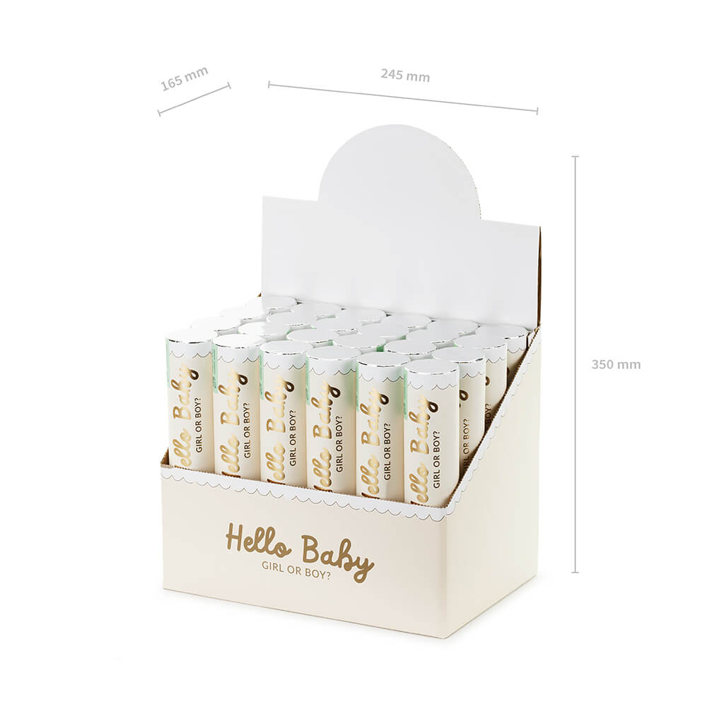 Verkünden Sie das Geschlecht Ihres Babys auf spektakuläre Weise mit dem Party Popper „Hello Baby“, gefüllt mit zauberhaften blauen Schmetterlingen. Dieser hochwertige Konfetti-Shooter sorgt für einen einzigartigen Überraschungsmoment auf jeder Gender Reveal Party, Babyparty oder Familienfeier.