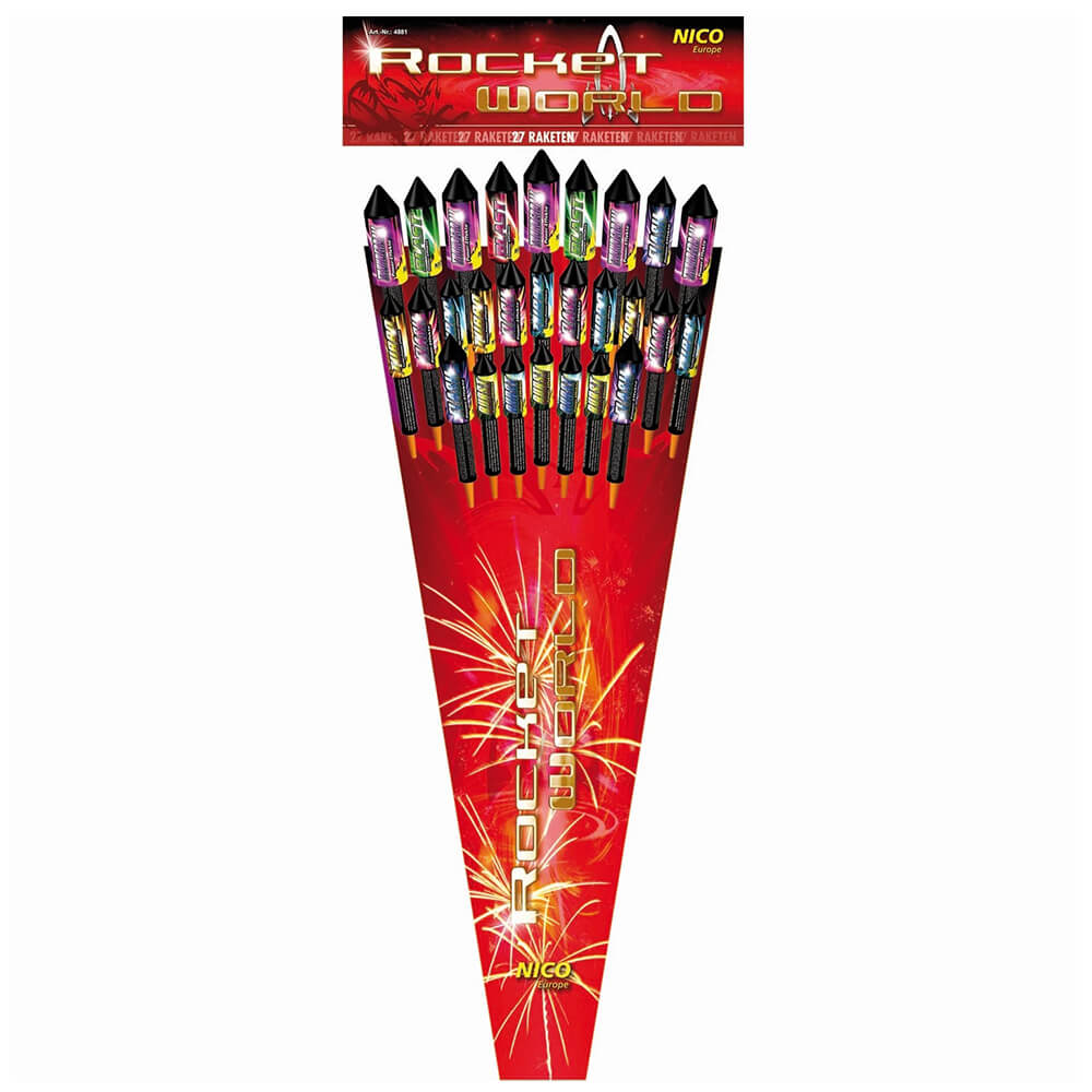 Rocket World ist ein riesiges 27-teiliges Feuerwerksraketen-Sortiment, das keine Wünsche offenlässt. Dieses vielseitige Raketen-Set für Silvester bietet ein buntes Potpourri aus prächtigen Farbeffekten und sorgt für abwechslungsreiche Highlights am Nachthimmel. Perfekt für alle, die klassische Feuerwerksraketen in großer Auswahl lieben.